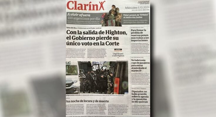 El presidente Alberto Fernández hizo referencia a la cobertura mediática de la renuncia de la ministra de la Corte Suprema de Justicia, Elena Highton de Nolasco (78), y se manifestó “impactado” por el título de tapa del matutino Clarín, que sostiene que, con la salida de la jueza, “el Gobierno” perdió “su único voto” en el máximo tribunal.