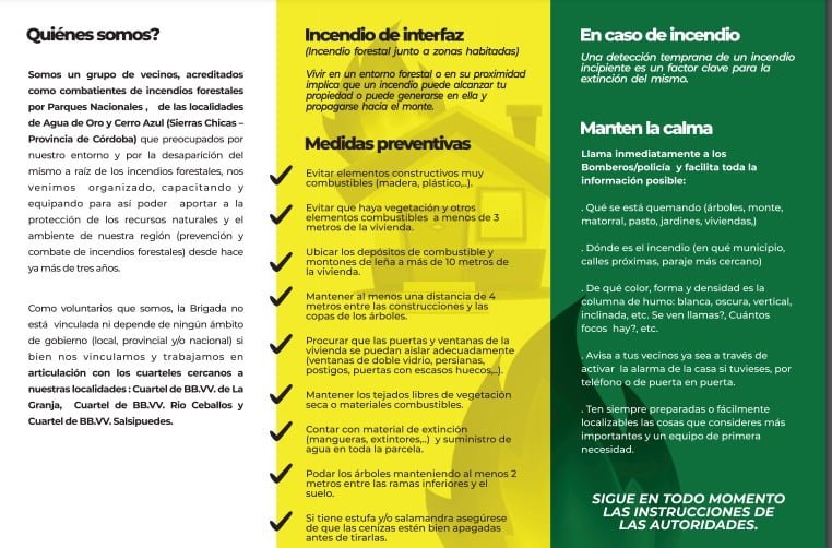Lo principal es relevar el terreno, con mapas, con el conocimiento que tienen los pobladores, y una vez que tenés ese estudio, creás brechas o líneas cortafuegos estratégicas, quizás uniendo un río con una calle, cerrando una zona por donde siempre escapa el fuego. En ese punto se lo puede esperar y controlar que no pase para el otro lado. Si no se hace un relevamiento, ¿cómo sabremos dónde hay fuentes de agua?, ¿cuáles son los vecinos que tienen grandes tanques de agua o piletas de natación?, ¿o si es una zona de interfase con viviendas y monte? Aquí en La Granja los bomberos vienen haciendo un relevamiento, y con la brigada lo haremos, pero cuesta conseguir los fondos”.