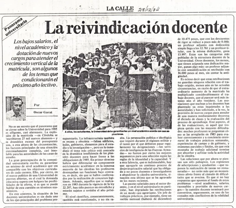 La lucha por el ingreso irrestricto había sido una realidad que se extendía por todo el ámbito de la UNC, con numerosas asambleas y movilizaciones. En las aulas de la ECI, aún permanecían profesores afines a la dictadura, pero con la militancia estudiantil se las logró, paulatinamente, democratizar. En eso, Garat tuvo mucho que ver. Tanto es así que en su gestión, con la aprobación del Consejo Directivo, se forjó la primera cátedra paralela de la materia Derecho Internacional. Justificada, entre otros episodios, porque la profesora a cargo de la oficial había invitado a disertar ante sus estudiantes a Luciano Benjamín Menéndez, cuentan los memoriosos.