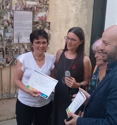 La escultora Elia Bisaro que realizó la estatuilla recibe el reconocimiento que le es entregado por Raúl Sansica, presidente de la Agencia Córdoba Cultura. Acompañan Tamara Pez y Soledad García, integrante de la Comisión Provincial de la memoria.