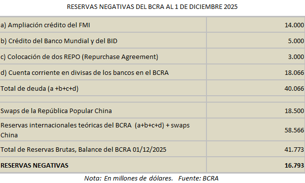 Cifras coherentes con el informe del FMI de noviembre 2025, en el que se explicita que las reservas internacionales del BCRA son negativas en 16.000 millones de dólares.