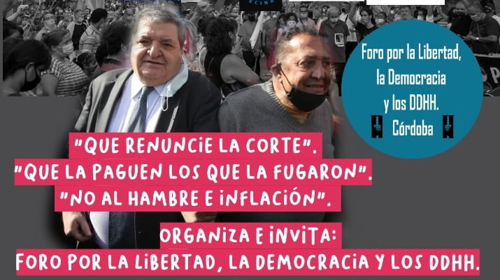 El Foro por la Libertad, la Democracia y los Derechos Humanos de Córdoba convoca a participar de la segunda movilización “Por la democratización de la justicia”. Destacan la presencia del juez Juan Ramos Padilla quien lidera la Multisectorial por la democratización de la Justicia y promueve la renuncia de los integrantes de la Corte. Las consignas locales aluden además a la deuda externa: “Que la paguen los que la fugaron”.
