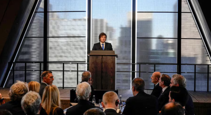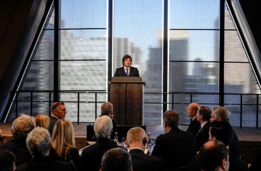 Jamie Dimon, CEO de JPMorgan Chase, presentó a Javier Milei en la charla con banqueros e inversionistas de los Estados Unidos el martes 10 de marzo de 2026, en el nuevo edificio que el banco estadounidense tiene en Nueva York.