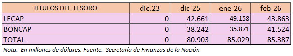 Que es una suma cada vez más importante, máxime que, por ejemplo, el gasto total del sector público nacional del mes de febrero de 2026 fue de 13,8 billones de pesos (al tipo de cambio oficial, menos de 9.000 millones de dólares) y los intereses capitalizados a ese mes suman 85.387 millones de dólares.
