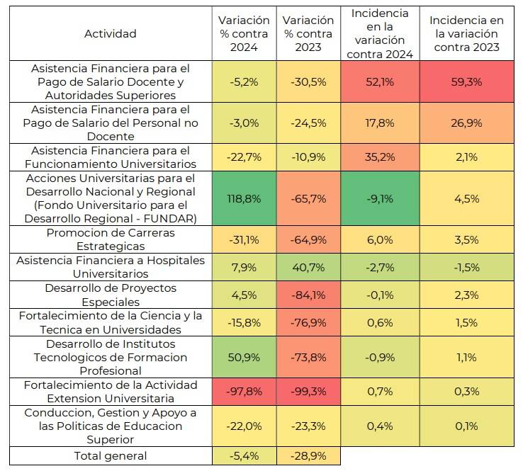 La comparación entre ambas fechas revela que los recursos destinados a las universidades sufrieron una caída real del 28,9%, mayormente explicada por los retrocesos salariales de docentes y no docentes. Aunque con escasa incidencia sobre el total, también se destaca la virtual desaparición de recursos para fortalecer las actividades de extensión, que fomentan la interacción de las universidades con sus comunidades fuera de aulas y laboratorios.